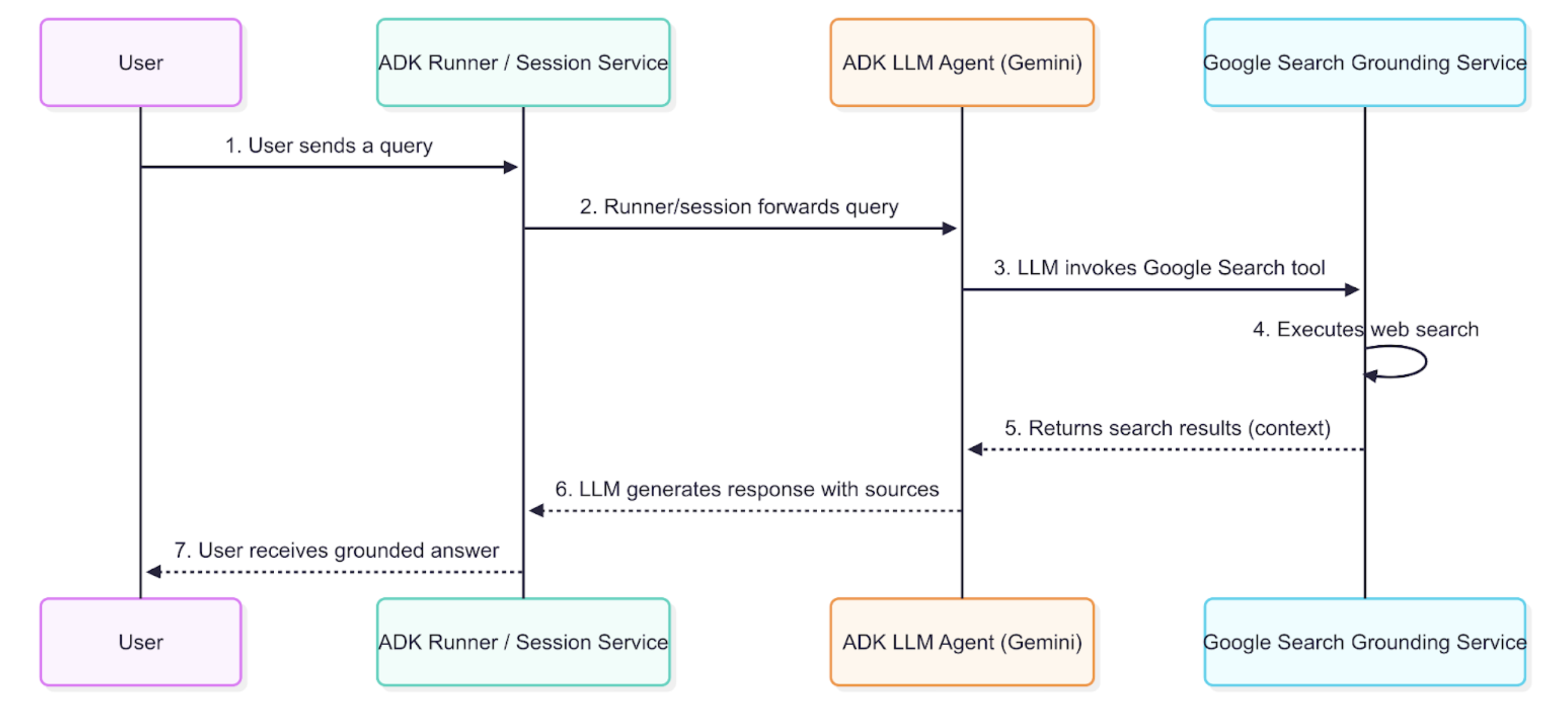 - Response Presentation with Sources: The ADK receives the final grounded response, which includes the necessary source URLs and